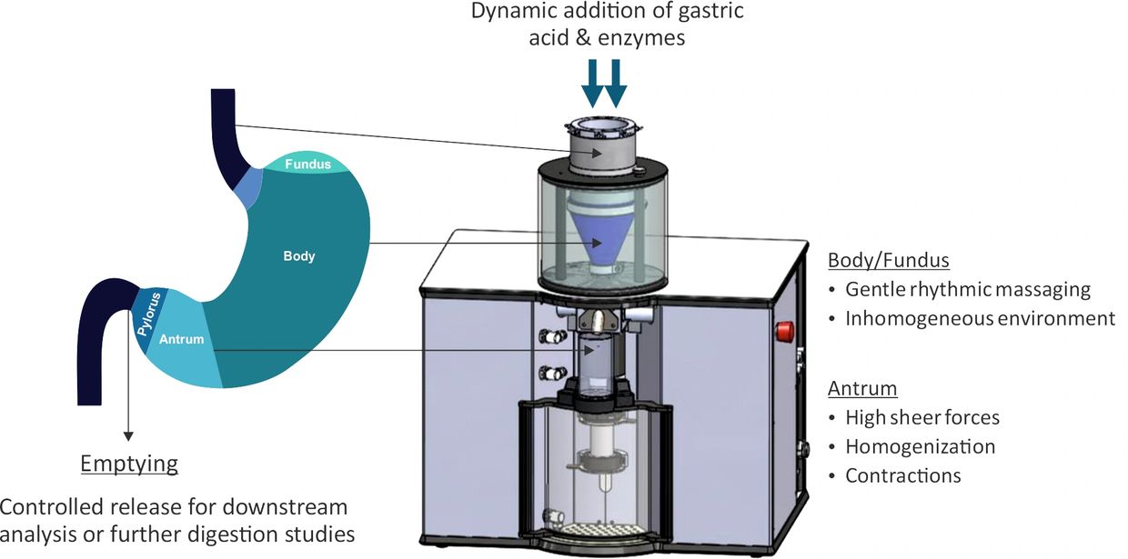 The Dynamic Gastric Model (DGM) is a bench-top AI-driven in vitro system that simulates digestion in the human stomach, allowing accurate prediction and understanding of the behaviour of food or drug preparations in real time. The DGM has been utilised for oral pharmaceutical development and food digestion studies for over 20 years, and has been extensively validated against human in vivo studies. The DGM, which simulates the fundus/main body and the antrum of the human stomach, accurately replicates the complex biochemical composition and gastric forces crucial for prediction of the bio-behaviour of API’s (Active Pharmaceutical Ingredient’s) and dosage forms for oral delivery.